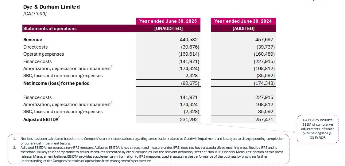 TORONTO, Nov. 12, 2025 /CNW/ – Dye & Durham Limited (the “Company” or “Dye & Durham“) (TSX: DND) today announced preliminary unaudited results for the fiscal year ended June 30, 2025 (“FY 2025”) and the first quarter of fiscal 2026 (“FY 2026”), together with an updated business outlook reflecting early progress under new leadership.